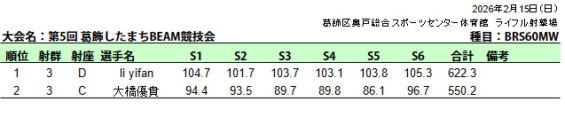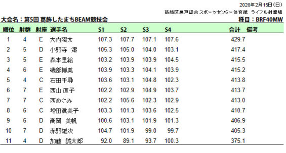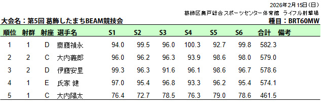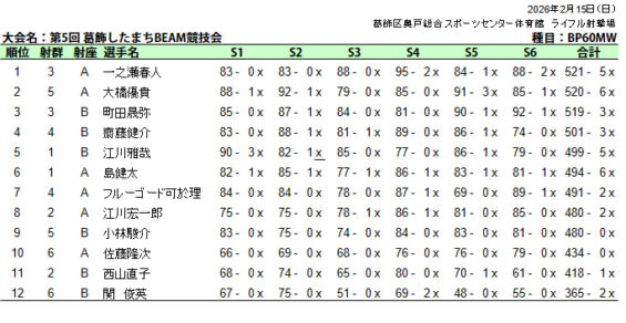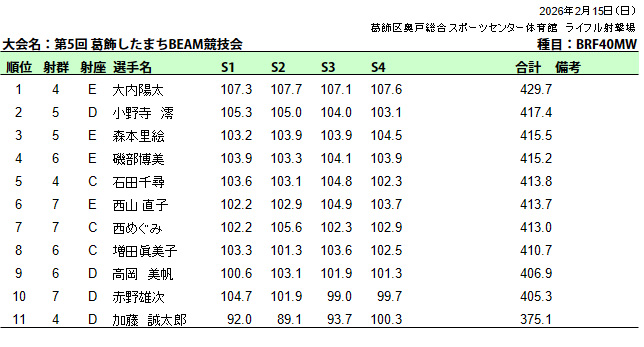 ビーム射撃競技会(葛飾区民大会秋季大会BRBP)成績表